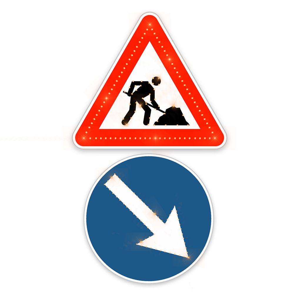 Aktīvā LED ceļa zīme Nr.118 “Uz ceļa strādā”, 700x700mm un Nr.410/411 “Bulta”, d=600mm
