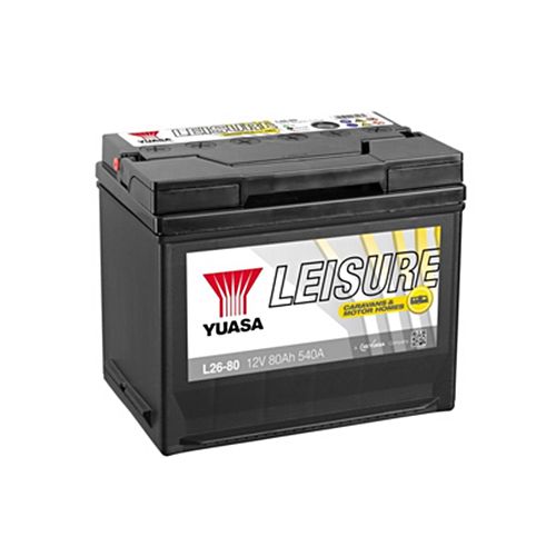 Akumulators YUASA M26-80 Leisure-Marine, 80Ah, strāvas stiprums 540A, polu izvadu izvietojums 1 (+ pols kreisajā pusē). Izmēri: 260x175x225mm.