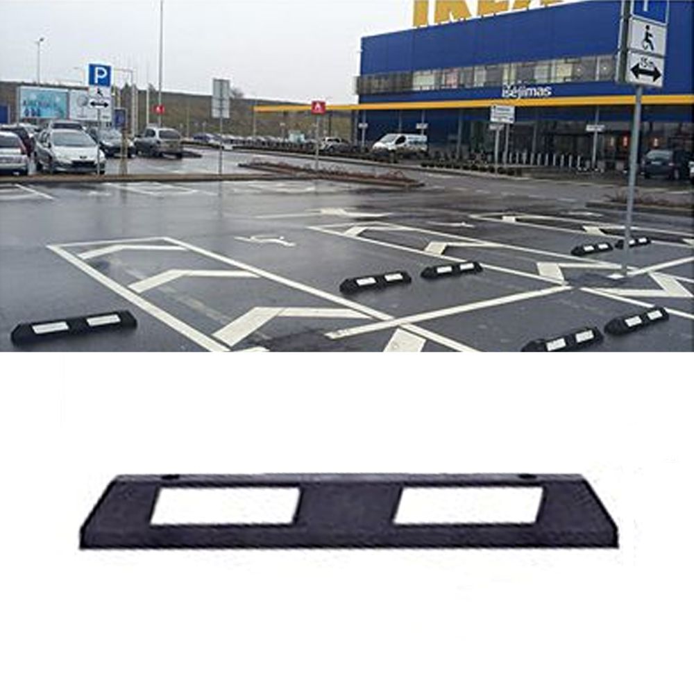 Atdures barjera. Izmēri: garums 900mm, platums 150mm, augstums 100mm. Krāsa: melna ar baltiem atstarotājiem. Materiāls: gumijas granulas + poliuretāns. UV staru izturīga. Stiprināšana ar 2 skrūvēm. Svars: 8kg.