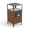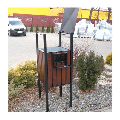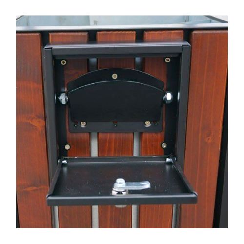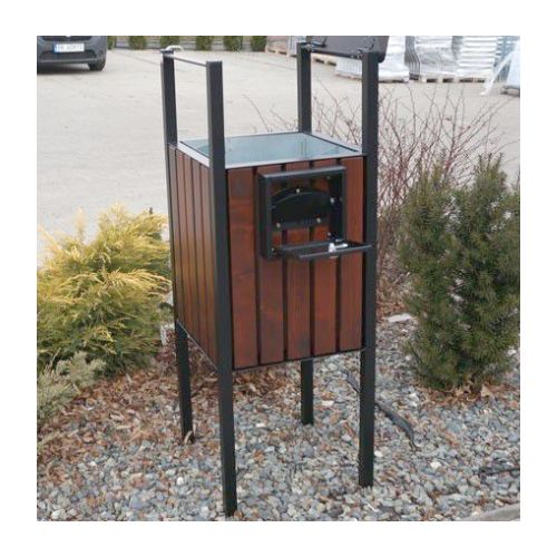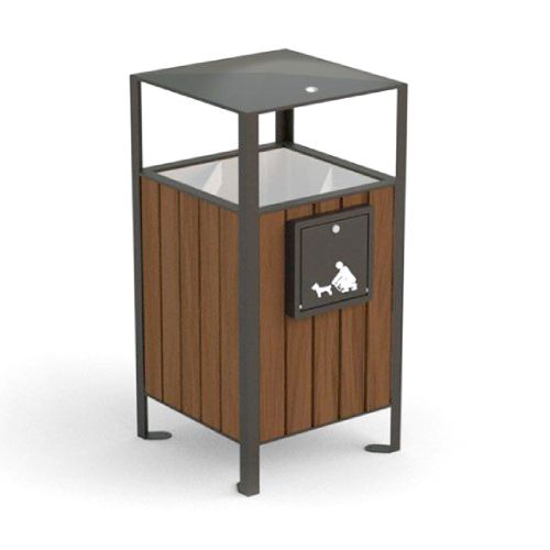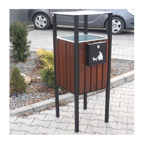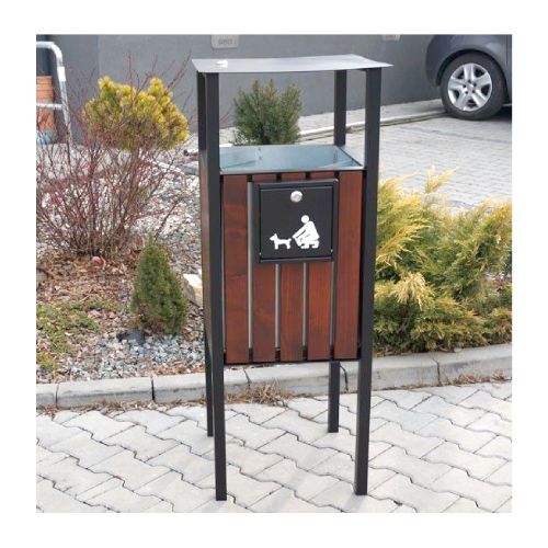 Atkritumu tvertne suņu ekskrementiem ar speciālo maisiņu dozatoru. Tilpums: 60l. Izmēri: platums 420mm, dziļums 420mm, augstums 900mm. Izgatavota no cinkota un krāsota metāla (metāla loksnes materiāls 1.5mm; metāla profils 30x30x1.5mm) ar skujkoka dēlīšiem – gaišs tīkkoks vai tumšs palisandrs. Montāžas veidi: betonējama vai stiprināma pie pamatnes ar skrūvēm. Iespēja izvēlēties RAL krāsu: melna RAL 9005; grafīta pelēka RAL 7021; sudraba pelēka RAL 9006; pelēka RAL 9007; brūna RAL 8011; dzeltena RAL 1023; zaļa RAL 6018; sarkana RAL 3002; oranža RAL 2000. Iespējams arī nerūsējošā tērauda tvertnes variants. Atkritumu iemešana no sānu pusēm augšpusē.