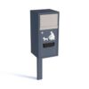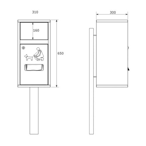 Atkritumu tvertne suņu ekskrementiem. Tilpums: 30l. Izmēri: platums 310mm, dziļums 300mm, augstums 950mm. Izgatavota no cinkota un krāsota metāla (metāla loksnes materiāls 1mm, metāla profils 60x30mm) ar nerūsējošā tērauda ieliktni. Pieejamie montāžas veidi – betonējama vai stiprināma pie pamatnes ar skrūvēm. Iespēja izvēlēties krāsu: melna RAL 9005; grafīta pelēka RAL 7021; sudraba pelēka RAL 9006; pelēka RAL 9007; brūna RAL 8011; dzeltena RAL 1023; zaļa RAL 6018; sarkana RAL 3002; oranža RAL 2000. Iespējams arī nerūsējošā tērauda tvertnes variants. Viegla atkritumu iztukšošana.