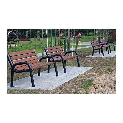 Atpūtas soliņš ar atzveltni un metāla korpusu, ar 7 koka dēļiem. Garums: 150cm. Kopējais augstums: 77cm. Augstums no zemes līdz sēdeklim: 43cm. Kopējais platums: 70cm. Sēdekļa platums: 46cm. Caurules izmērs: diametrs 60,3mm x 2mm. Metāla korpuss krāsots un cinkots. Stiprināšana pie pamatnes ar 4 skrūvēm. Soliņš pieejams dažādās korpusa un dēlīšu krāsās. Svars: 25kg.