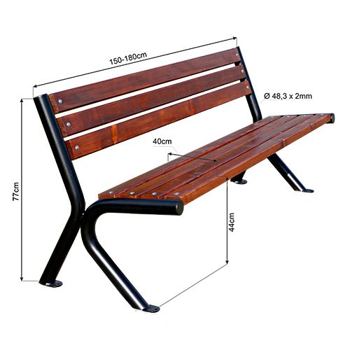 Atpūtas soliņš ar atzveltni un metāla korpusu, ar 7 koka dēļiem. Garums: 150cm. Kopējais augstums: 77cm. Augstums no zemes līdz sēdeklim: 44cm. Sēdekļa platums: 40cm. Caurules izmērs: diametrs 48,3mmx2mm. Metāla korpuss krāsots un cinkots. Stiprināšana pie pamatnes ar 4 skrūvēm. Soliņš pieejams dažādās korpusa un dēlīšu krāsās. Svars: 26kg.
