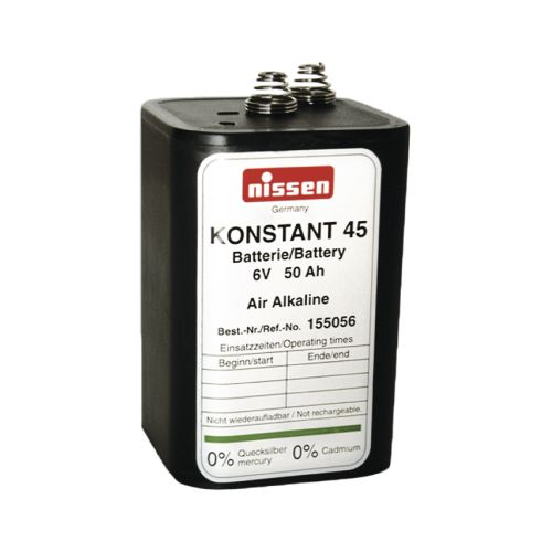 Baterija signāllukturim. 6V 45-50Ah. Baterijas izmēri: 67x98x67mm. Ilgs baterijas darbības laiks (nepārtraukti 1400h; mirgojoši – 5500h). Izturība līdz -25 grādiem pēc Celsija. Pastāvīga izlādes līkne lukturu pastāvīgai spilgtībai. Bez kadmija un dzīvsudraba. Kastē – 12gab.