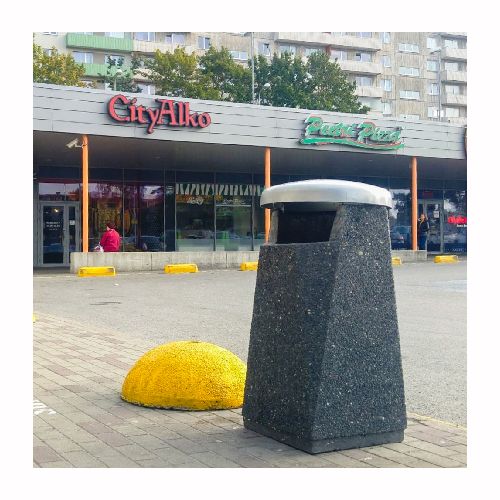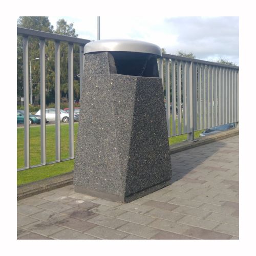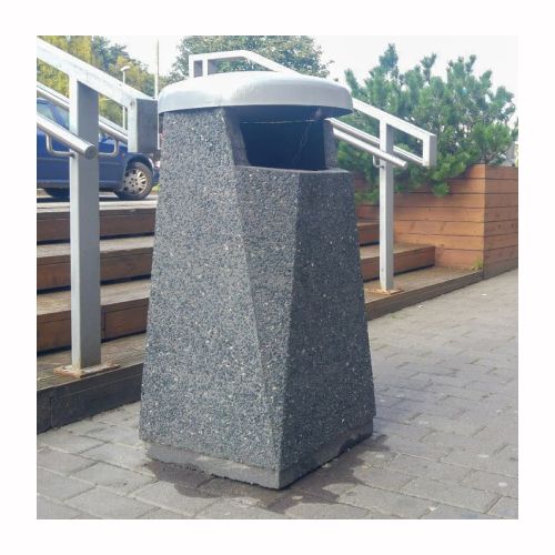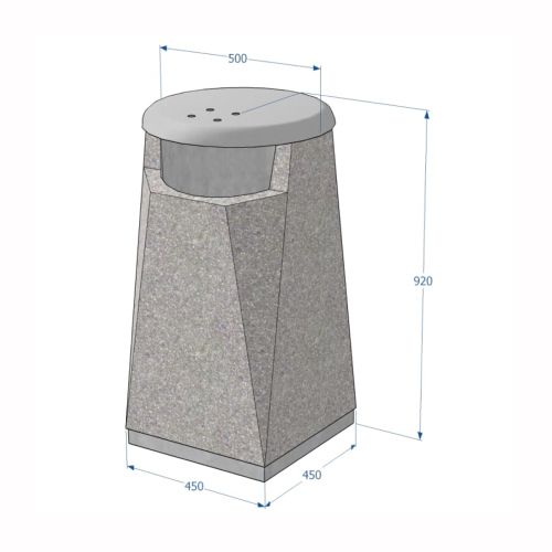 Betona atkritumu tvertne ar pulverkrāsotu metāla vāku. Izmēri: garums 450mm, platums 450mm, augstums 920mm. Tilpums: 50L. Svars: 170kg. Iespējamie betona toņi: P101, P103, P106, S101, S103, S104.