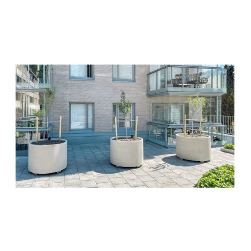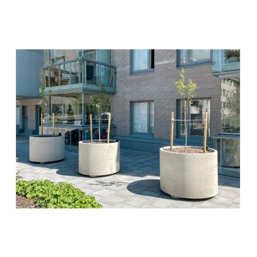 Betona puķu pods (apaļš). Izmēri: diametrs 1200mm, augstums 900mm. Svars: 740kg. Iespējamie betona toņi: S101, S103, S104, S205.