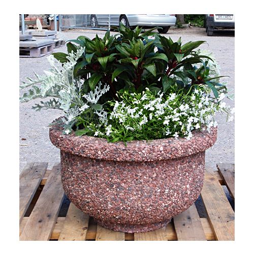 Betona puķu pods (apaļš). Izmēri: diametrs 500mm, augstums 310mm. Svars: 45kg. Iespējamie betona toņi: P101, P103, P104, P106.