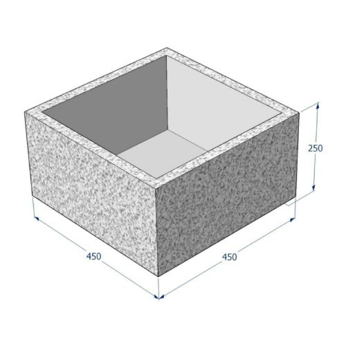 Betona puķu pods (kvadrātveida). Izmēri: garums 450mm, platums 450mm, augstums 250mm. Svars: 54kg. Iespējamie betona toņi: P101, P103, P104, P106, L101, L102, L103, L104, L105, L106, L107, L201, L202, L203, L303, L304, L405, L406, L407.