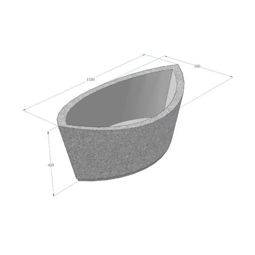 Betona puķu pods (laivas tipa). Izmēri: garums 1100mm, platums 580mm, augstums 420mm. Svars: 130kg. Pieejamie betona toņi: P101, P102, P103, P104, P106, P107, P108, P109, P201, P202, P203, P301, P303, P410, P412, P414.
