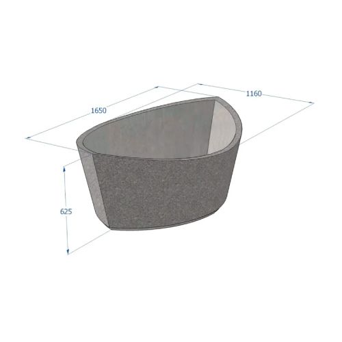 Betona puķu pods (laivas tipa). Izmēri: garums 1650mm, platums 1160mm, augstums 625mm. Svars: 370kg. Pieejamie betona toņi: P101, P103, P104, P106, P107, P108, P109, P201, P202, P203, P301, P303, P410, P412, P414.