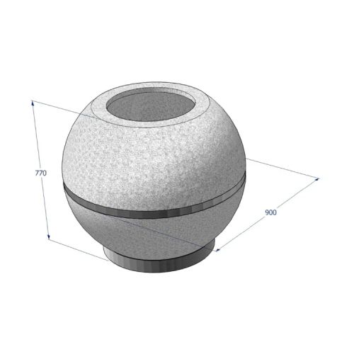 Betona puķu pods (lodveida). Ar nerūsējošā tērauda pamatni un joslu poda vidus daļā. Izmēri: diametrs 900mm, augstums 700mm. Svars: 385kg. Iespējamie betona toņi: P101, P103, P104, P106, P107, P108, P109, P201, P202, P203, P301, P303, P410, P412, P414.