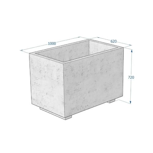 Betona puķu pods (taisnstūrveida). Izmēri: garums 1000mm, platums 620mm, augstums 720mm. Svars: 370kg. Iespējamie betona toņi: S101, S102, S103, S104, S201, S202, S203, S204, S205.