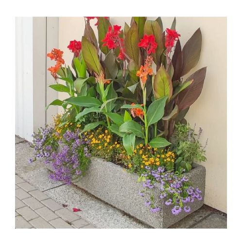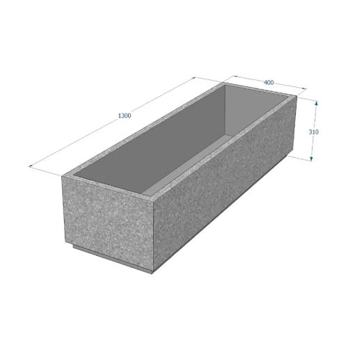 Betona puķu pods (taisnstūrveida). Izmēri: garums 1300mm, platums 400mm, augstums 310mm. Svars: 135kg. Iespējamie betona toņi: P101, P103, P104, P106, S101, S103, S104, S205.