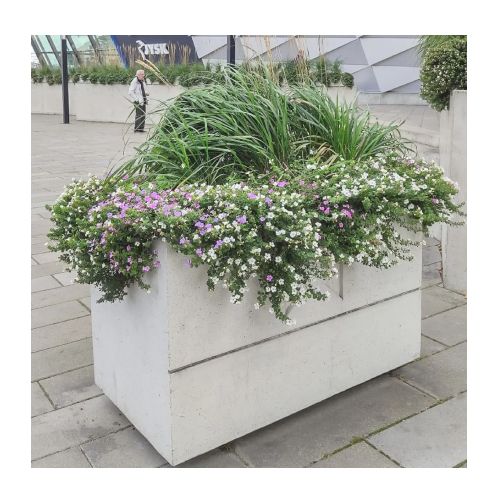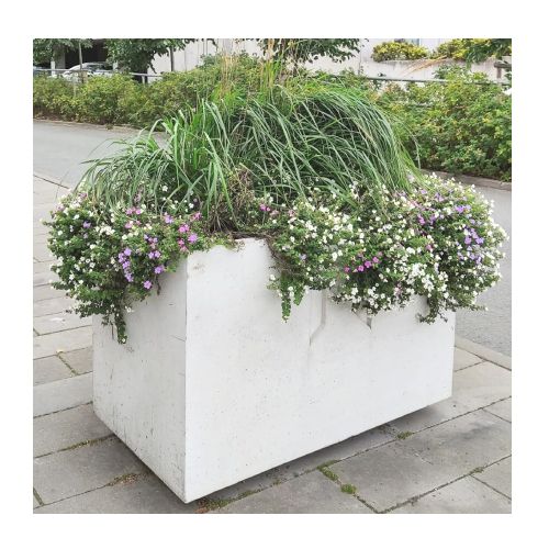 Betona puķu pods (taisnstūrveida). Izmēri: platums 700mm, garums 1300mm, augstums 800mm. Svars: 600kg. Iespējamie betona toņi: S101, S102, S103, S104, S201, S202, S203, S204, S205.