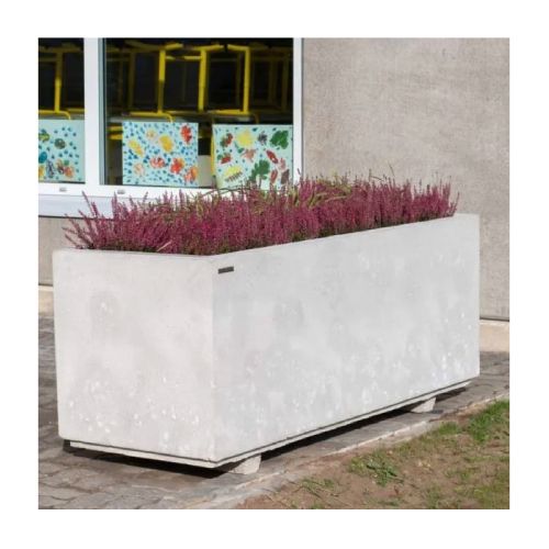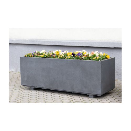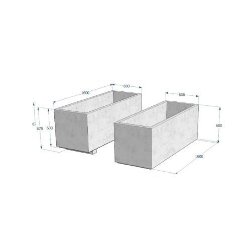 Betona puķu pods (taisnstūrveida). Izmēri: garums 1600mm, platums 600mm, augstums 600mm. Svars: 475kg. Iespējamie betona toņi: S101, S102, S103, S104, S201, S202, S203, S204, S205. Pieejams ar pamatnes kājām vai bez tām.