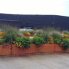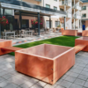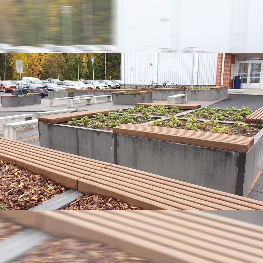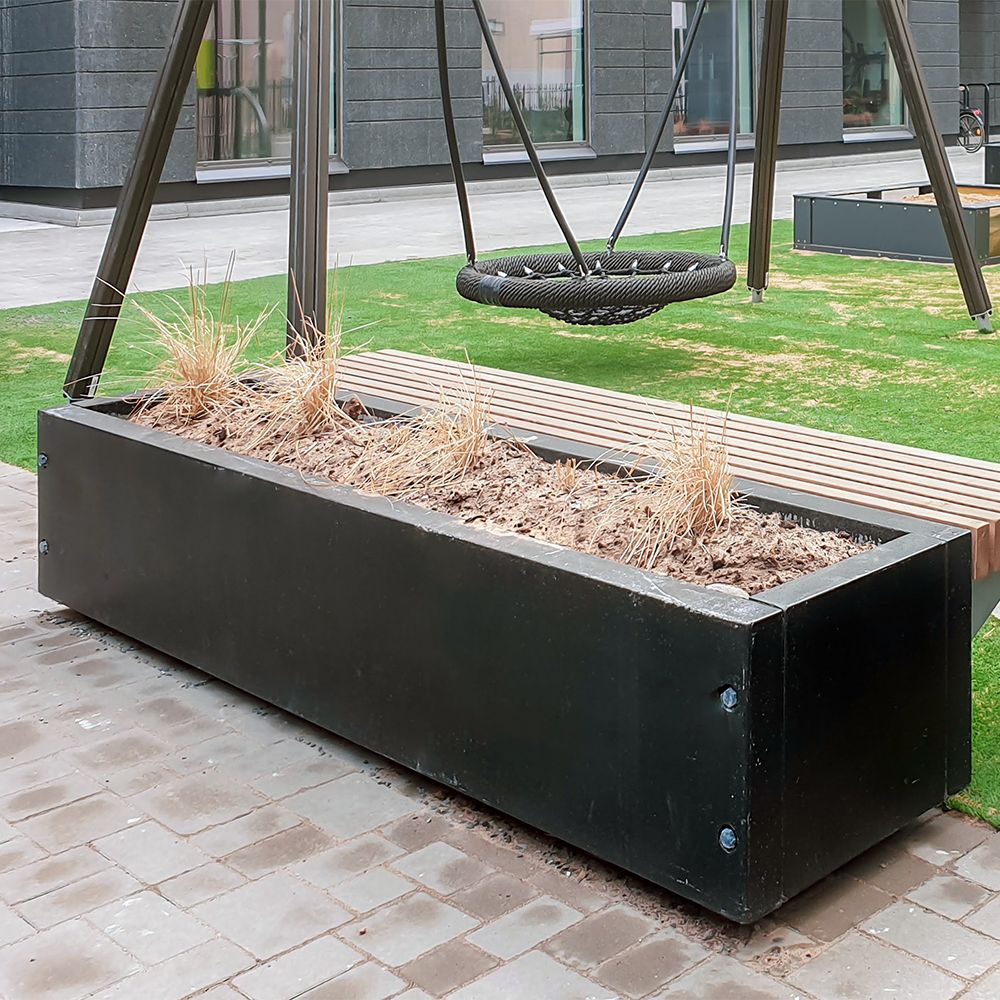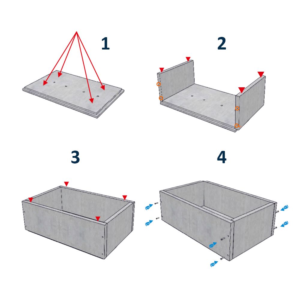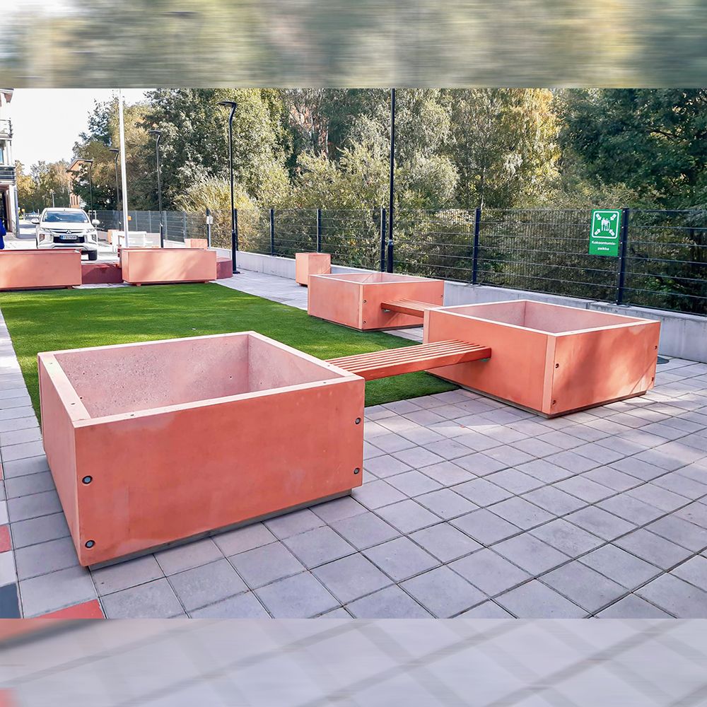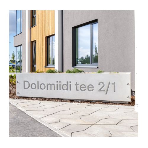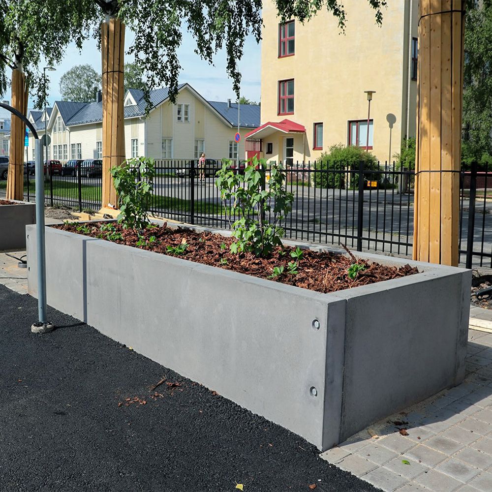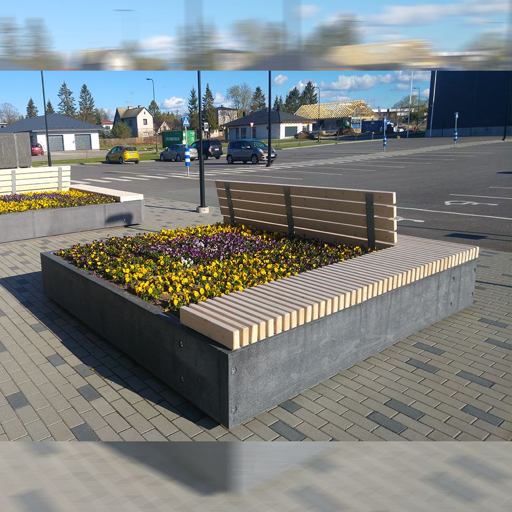 Betona puķu pods (taisnstūrveida). Tiek piegādāts pa detaļām (nav samontēts kopā). Izmēri: plākšņu biezums 80mm, garums un augstums pēc pasūtījuma. Svars atkarīgs no betona plākšņu izmēriem. Betona apdare: gluds betons vairākos toņos. Iespējams ar uzrakstu/tekstu vai simbolu betonā.
