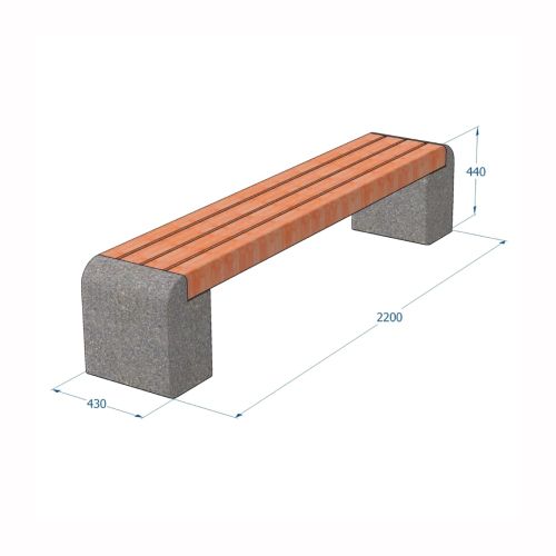 Betona soliņš ar koka dēlīšiem. Izmēri: garums 2200mm, platums 430mm, augstums 440mm. Svars: 240kg. Apdares metode: mazgāts betons. Iespējamie betona toņi: P101, P103, P106. Iespējamie koka dēlīšu toņi: 5050, 5053, 5055, 5059, 5061, 5066, 5068, 5071, 5072, 5075, 5076, 5077, 5085, 5086, 5089.
