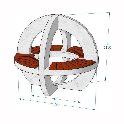 Betona soliņš (lodes formas). Izmēri: garums 1290mm, platums 1290mm, augstums 1150mm. Svars: 440kg. Iespējamie betona toņi: S101, S102, S103, S104, S201, S202, S203, S204, S205. Iespējamie koka dēlīšu toņi: 5050, 5053, 5055, 5059, 5061, 5066, 5068, 5071, 5072, 5075, 5076, 5077, 5085, 5086, 5089.
