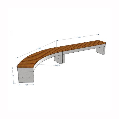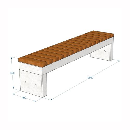 Betona soliņš (moduļveida). Pieejams arī ar koka dēlīšiem (par papildus samaksu). Izmēri: garums 1840mm, platums 400mm, augstums 450mm. Svars: 245kg. Iespējamie gludā betona toņi: S101, S102, S103, S104, S201, S202, S203, S204, S205. Iespējamie koka dēlīšu toņi: 5050, 5053, 5055, 5059, 5061, 5066, 5068, 5071, 5072, 5075, 5076, 5077, 5085, 5086, 5089.