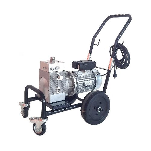 Bezgaisa diafragmas sūknis 12000 F-V. Elektrisks, bezgaisa krāsošanai celtniecībā, hidroizolācijā, rūpniecībā, galdniecībā, kuģu būvē u.c. Lietojamie materiāli ar šo sūkni: akrils, sintētiskie sveķi, elpojošas krāsas, ūdens bāzes krāsas, mazgājamas krāsas, gruntskrāsas, pildvielas. Vertikālā konfigurācija. Maksimālā tilpuma plūsma: 7l/min. Maksimālais spiediens: 250 bāri. Elektrisks motors, 3 ZS. Motora izeja 230V, vienfāzu. Sakabes dzinējs – sūknis ar atloku, elastīgu savienojumu. Fotoattēls neatspoguļo standarta versiju.
