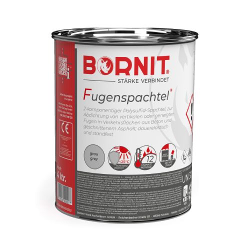 BORNIT® Fugenspachtel šuvju masa. Krāsa: pelēka. Iepakojums: 4l bundža. Stingra šuvju masa, izgatavota no polisulfīda. Divkomponentu. Paredzēta vertikālu un slīpu šuvju hermetizēšanai, būvējot pazemes vai virszemes būves. Tepe ilgi saglabā elastību, iztur lielu mehānisko slodzi. Izturīga pret jūras ūdeni, benzīnu un minerāleļļas veidiem. Virsma gruntējama atkarībā no lietošanas gadījuma. Gruntējama ar BORNIT® sākotnējo betona grunti (BORNIT® Betonprimer) vai BORNIT® sākotnējo asfalta grunti (BORNIT® Asphaltprimer). Patēriņš: atkarīgs no šuves lieluma.