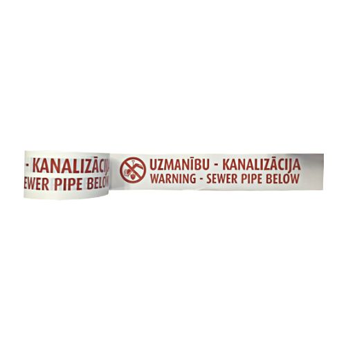Brīdinājuma lenta “Uzmanību – kanalizācija”. Izmēri: platums 100mm, garums rullī 200m. Biezums 100 mikroni. Noturība līdz 80 gadiem.