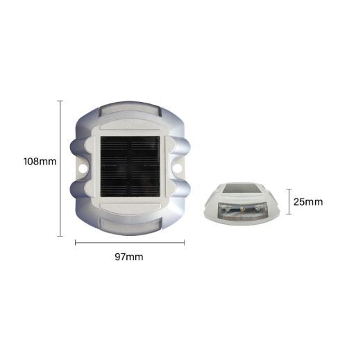 Ceļa atstarotājs, kas aprīkots ar LED diodēm un saules baterijām. Krāsa: dzeltena. Izmēri: garums 108mm, platums 97mm, augstums 25mm. Saules panelis: 2.5V/120mAh. Akumulators: 1.2V/600mAh (NI-Mh baterija). Darba režīmi: mirgojošs vai pastāvīgs. Aprīkota ar 6gab. ļoti gaišām LED diodēm (d=5mm). Redzes diapazons: vairāk kā 800m. Gaismas intensitāte: 400-500lx. Darba temperatūra: -20 līdz +80 grādi pēc Celsija. Ūdensizturības klase: IP68. Darbības ilgums: vairāk kā 200h mirgojošajam režīmam/72h pastāvīgajam režīmam. Darbības ilgums: 3-5 gadi. Saspiešanas pretestība: >20T. Materiāls: polikarbonāts (PC) un alumīnijs. Stiprināms asfaltā vai betonā ar 2 skrūvēm vai pielīmējams ar speciālu līmi.