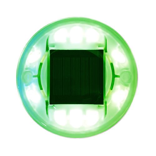 Ceļa atstarotājs, kas aprīkots ar LED diodēm un saules baterijām. Krāsa: zaļa. Izmēri: diametrs 122mm, augstums 25mm. Saules panelis: 2.5V/120mAh Ni-Mh baterijai vai 3.2V/500mAh Litija baterijai. Akumulators: 1.2V/600mAh, 1.2V/1300mAh, 1.2V/1500mAh BI-Mh baterijai vai 3.2V/500mAh Litija baterijai. Darba režīmi: mirgojošs (120 reizes/minūtē) vai pastāvīgs. Aprīkots ar 6gab. ļoti gaišām LED diodēm (d=5mm). Redzes diapazons: vairāk kā 800m. Gaismas intensitāte: 400-500lx. Darba temperatūra: -20 līdz ~+60 grādi pēc Celsija. Ūdensizturības klase: IP68. Darbības ilgums: vairāk kā 200h mirgojošajam režīmam/50-72h pastāvīgajam režīmam atkarībā no baterijas lieluma. Darbības ilgums: 3-5 gadi NI-mAh baterijai; 5-8 gadi Litija baterijai. Saspiešanas pretestība: >10T. Materiāls: polikarbonāts (PC) un alumīnijs. Nerūsējošā tērauda skrūves. Gumijas blīve. Alumīnija korpuss. Stiprināms asfaltā vai betonā ar speciālu līmi.