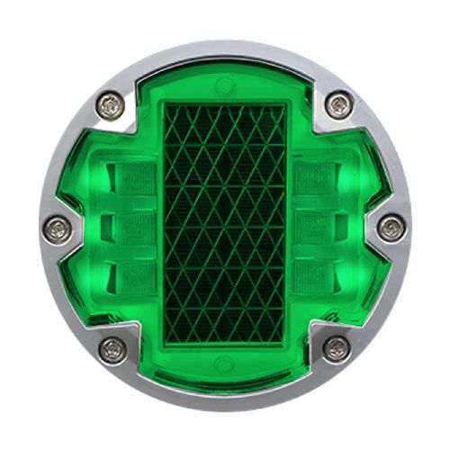 Ceļa atstarotājs, kas aprīkots ar LED diodēm un saules baterijām. Krāsa: zaļa. Izmēri: diametrs 143mm, augstums 50mm. Saules panelis: 5V/140mAh. Akumulators: 3.2V/1500mAh (litija baterija). Darba režīmi: mirgojošs (120 reizes/minūtē) vai pastāvīgs. Aprīkota ar 6gab. ļoti gaišām LED diodēm. Redzes diapazons: vairāk kā 1000m. Gaismas intensitāte: 400-500lx. Darba temperatūra: -20 līdz +80 grādi pēc Celsija. Ūdensizturības klase: IP68. Darbības ilgums: vairāk kā 220h mirgojošajam režīmam/100h pastāvīgajam režīmam. Darbības ilgums: >5-8 gadi litija baterijai. Saspiešanas pretestība: >100T. Materiāls: polikarbonāts (PC) un alumīnijs. Nerūsējošā tērauda skrūves. Gumijas blīve. Alumīnija korpuss. Stiprināms asfaltā vai betonā ar speciālu līmi. Iztur 80t slodzi.