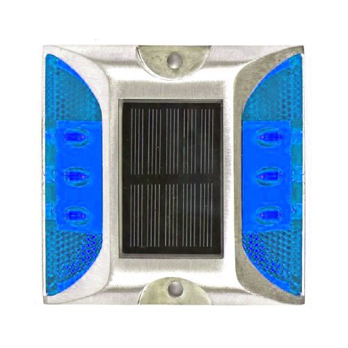 Ceļa atstarotājs, kas aprīkots ar LED diodēm un saules baterijām. Krāsa: zila. Izmēri: garums 105mm, platums 105mm, augstums 25mm. Saules panelis: 2.5V/120mAh. Akumulators: 1.2V/600mAh (NI-Mh baterija). Darba režīmi: mirgojošs vai pastāvīgs. Aprīkota ar 6gab. ļoti gaišām LED diodēm (d=5mm). Redzes diapazons: vairāk kā 800m. Gaismas intensitāte: 400-500lx. Darba temperatūra: -20 līdz +80 grādi pēc Celsija. Ūdensizturības klase: IP68. Darbības ilgums: vairāk kā 200h mirgojošajam režīmam/72h pastāvīgajam režīmam. Darbības ilgums: 3-5 gadi. Saspiešanas pretestība: >20T. Materiāls: polikarbonāts (PC), alumīnijs un PMMA atstarotājiem. Alumīnija korpuss. Stiprināms asfaltā vai betonā ar 2 skrūvēm vai pielīmējams ar speciālu līmi.