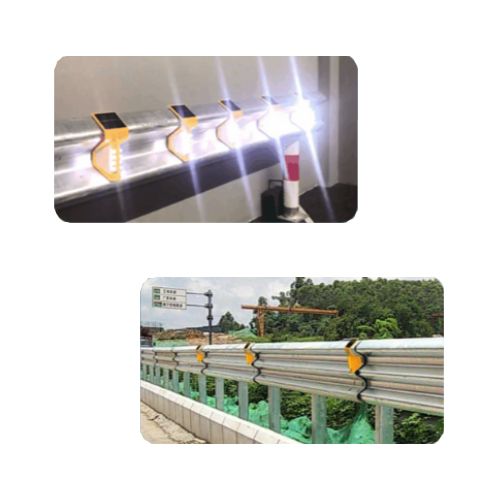 Ceļa barjeru atstarotājs (montējams barjerā, abpusējs). Aprīkots ar solāro (saules) paneli un 4 LED diodēm katrā atstarotāja pusē (kopā 8 LED diodes, diodes d=8mm). Solārais panelis: 3V, 180mA. Krēslā/tumsā mirgoši LED vai vienmērīga gaisma. Atstarotāja krāsa: balta. Materiāls: plastmasa un akrils. Izmēri: garums 95mm, platums 95mm, augstums 260mm. Pielieto piestiprināšani ceļu norobežošanas barjerās u.c. Pieejamie veidi: abpusēji dzeltens, abpusēji balts vai cits individuāls veids pēc pasūtījuma. Svars: 0.37kg.