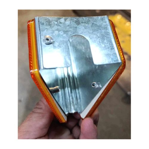 Ceļa barjeru atstarotājs (montējams barjerā, abpusējs). Krāsa: balta-oranža. Materiāls: tērauda stiprinājums un polimēru materiāla (PMMA). Izmēri: garums 121mm, platums 70.5mm, augstums 50/65mm. Stiprinājums biezums: 1.5mm. Pielieto piestiprināšani ceļu norobežošanas barjerās u.c. Ūdens un saules izturīgs. Pieejamie veidi: abpusēji dzeltens, abpusēji sarkans un balts-dzeltens katrā pusē vai cits individuāls veids pēc pasūtījuma. Kastē: 100gab. Cena par gab.!