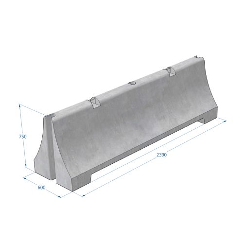 Ceļa norobežošanas barjera (komplektā bez metāla caurules). Izmēri: garums 2390mm, platums 600mm, augstums 750mm. Krāsa: pelēka (betona tonis). Piemērota ceļa joslu norobežošanai. Svars: 1270kg.