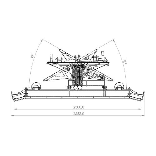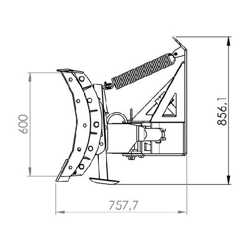 Diagonālā sniega lāpsta (priekšpusē uzstādāma, hidrauliska) ar grozāmiem sānu spārniem. Skrūvējams stiprinājums Trima. Darba platums 2000mm+250mm+250mm (kopā 2500mm). Darba augstums: 600mm. Maināmi tērauda naži. Hidrauliski grozāms priekšējais vairogs. Lāpstai ir dubulti noņemami sānu spārni (spārni palīdz viegli tikt galā ar lielāku sniega daudzumu).Sniega lāpstas atbalsta pēdas sadala spēku uz leju, neļaujot iegrimt zemē un nevajadzīgi nodilt tērauda nažiem. Augstais nazis (asmens) nodrošina izcilu veiktspēju, lai tiktu galā ar lielu sniega daudzumu. Aukstā laikā (ap -20°C), sniegs neuzkrājas naža augstuma dēļ, uzlabo redzamību un palielina drošību. Nepieciešama divkāršās darbības hidrauliskā traktora jauda. Hidrauliska sānu regulēšana ar iespaidīgu +30/-30° pagriešanas diapazonu. Aprīkota ar pārslodzes vārstu, divām hidrauliskajām šļūtenēm ar ½ collu ātrajiem savienojumiem. Svars: 383kg.