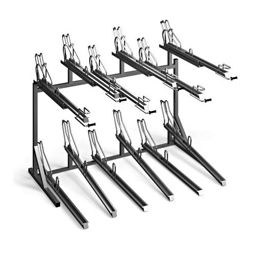 Divlīmeņu velosipēdu statīvs. Izmēri: garums 265cm, augstums 205cm, nepieciešamais dziļums 290cm, ieteicamais minimālais telpas augstums 280cm. Divu līmeņu velo statīvs, kas ir ideāls risinājums velosipēdu novietnēm, kam ir nelielas izmantojamās platības. Stenda dizains ļauj optimāli izmantot telpas lielumu, izmantojot divus velosipēdu stāvēšanas līmeņus.