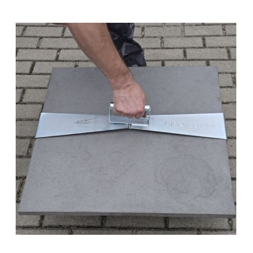 Flīžu-plātņu satvērējs. Paredzēts 600x600x20mm plātņu pārvietošanai, pacelšanai un ieklāšanai. Kravnesība: 30kg. Attālums starpā 600mm. Cinkots. Svars: 1,5kg.