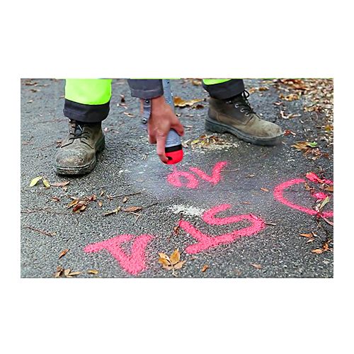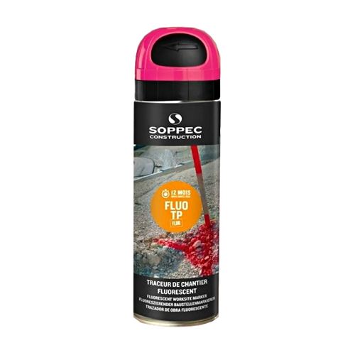 FLUO TP luminiscējoša krāsa marķēšanai (aerosols), rozā, 500ml. Kastē 12gab. Ūdensizturīga, piemērota arī uz mitrām virsmām. Ātri žūstoša (~10min.). 12 mēnešu noturība. Piemērota marķēšanai uz betona, asfalta, zāles, grants, akmens, kokiem u.c. Liels fluorescējošo pigmentu blīvums, tāpēc ļoti labi pamanāma. Izmantojama temperatūrā no -20 līdz + 50 grādiem pēc Celsija. Ar 1 aerosola baloniņu var noklāt ~80m (2cm platumā). Var pūst ar rokas pistoli un pistoli uz 1 riteņa.