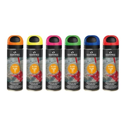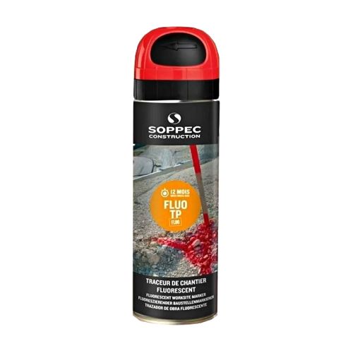 FLUO TP luminiscējoša krāsa marķēšanai (aerosols), sarkana, 500ml. Kastē 12gab. Ūdensizturīga, piemērota arī uz mitrām virsmām. Ātri žūstoša (~10min.). 12 mēnešu noturība. Piemērota marķēšanai uz betona, asfalta, zāles, grants, akmens, kokiem u.c. Liels fluorescējošo pigmentu blīvums, tāpēc ļoti labi pamanāma. Izmantojama temperatūrā no -20 līdz + 50 grādiem pēc Celsija. Ar 1 aerosola baloniņu var noklāt ~80m (2cm platumā). Var pūst ar rokas pistoli un pistoli uz 1 riteņa.