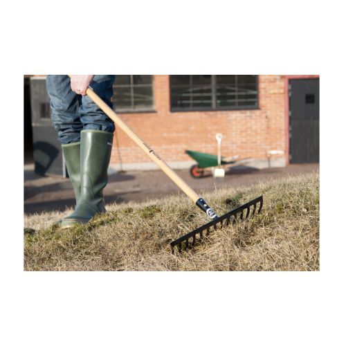 Rūdīta tērauda grābeklis dažādu virsmu līdzināšanai. Grābekļa izmērs: 380x85mm. Kopējais garums ar kātu: 1700mm (kāts 28x1650mm). 14 zari.