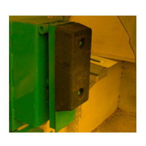 Gumijas aizsargs. Izgatavots no vulkanizētas gumijas. Krāsa: melna. 2 caurumi skrūvju vietām. Izmēri: augstums 450mm, platums 250mm, biezums 100mm, attālums starp caurumu centriem 262.5mm, caurumu d=53mm (iekšpusē d=20mm). Izmanto, lai aizsargātu iekraušanas/izkraušanas vietas, absorbētu triecienus, tērauda konstrukcijas pie noliktavām, ostās vai citur. Nodrošina papildus aizsardzību pret bojājumiem. Atsevišķi iespējams iegādāties aizmugurējo metāla plāksni ar metinātām tapām, paplākšņiem un uzgriežņiem.