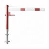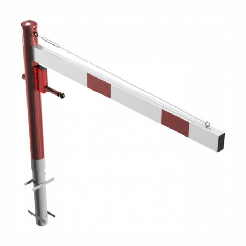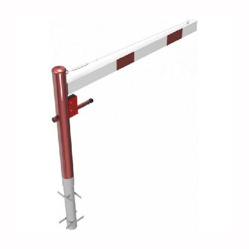 ar tapu, bloķēšana 4 pozīcijās (ik pēc 90 grādiem). Betonējama (ieteicamie betona pamata izmēri 550x550x900mm). Pieejams arī modelis, kur barjera stiprināma pie pamatnes (pēc pieprasījuma). Izmēri: horizontālās barjeras garums 1500mm, vertikālais stabs (karsti cinkots un krāsots sarkans) d=102mm, horizontālā barjera (alumīnija caurule) 100x50mm – balta ar sarkanām atstarojošām joslām, augstums virs zemes 950mm. Karsti cinkota ar baltu korpusu un sarkanām joslām. Svars: 32kg.