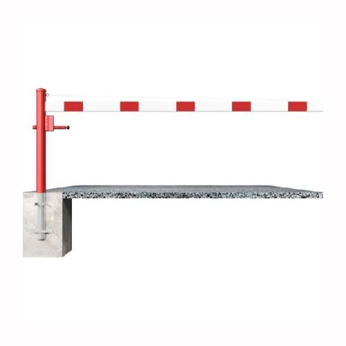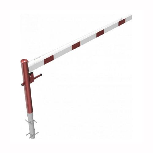 ar tapu, bloķēšana 4 pozīcijās (ik pēc 90 grādiem). Betonējama (ieteicamie betona pamata izmēri 550x550x900mm). Pieejams arī modelis, kur barjera stiprināma pie pamatnes (pēc pieprasījuma). Izmēri: horizontālās barjeras garums 2500mm, vertikālais stabs (karsti cinkots un krāsots sarkans) d=102mm, horizontālā barjera (alumīnija caurule) 100x50mm – balta ar sarkanām atstarojošām joslām, augstums virs zemes 950mm. Karsti cinkota ar baltu korpusu un sarkanām joslām. Svars: 34kg.