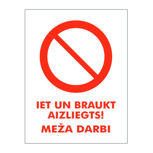 Informatīva plāksne “Iet un braukt aizliegts! Meža darbi”. Izmēri: 260x340mm. Pamatne – balts putukartons (3mm biezumā).