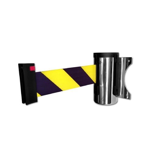 Izvelkama norobežošanas lenta ar iekļautu plastmasas sienas stiprinājumu (stiprināms ar skrūvēm). Pulēta nerūsējošā tērauda korpuss. Izmēri: lentas platums 48mm, garums 3m. Lentas krāsa: dzeltenmelna. Aprīkota ar bremžu sistēmu. Svars: 0.5kg.