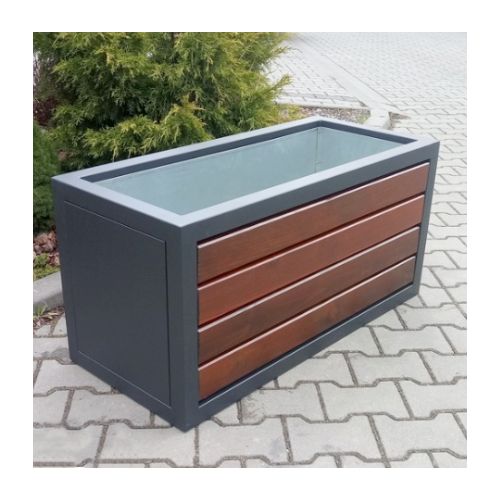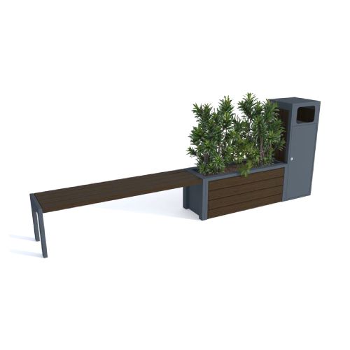 Komplekts ar soliņu, puķu podu un atkritumu tvertni. Izmēri: kopējais garums: 3590mm, dziļums 440mm. Cinkots/krāsots puķu pods un soliņš ar koka dēlīšiem. Materiāls: cinkots un krāsots tērauds (pieejama arī nerūsējošā tērauda versija), skujkoka dēlīši (tonis gaišs ozols vai palisandrs (tumšs). Metāla detaļas krāsotas RAL tonī (pieejamie toņi: melna RAL 9005; grafīta pelēka RAL 7021; sudraba pelēka RAL 9006; pelēka RAL 9007; brūna RAL 8011; dzeltena RAL 1023; zaļa RAL 6018; sarkana RAL 3002; oranža RAL 2000). Izmantojams gan ārā, gan iekštelpās.