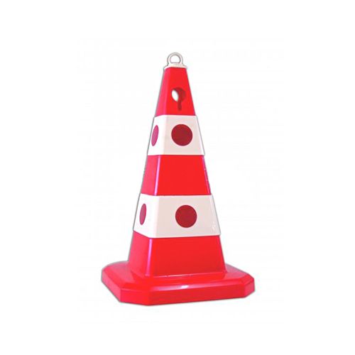 Konuss (smagais), PP. Augstums 62cm. Aprīkots ar atstarotājiem. Krāsa: sarkana. Pamatnes izmērs: 37x37cm. Caur konusu iespējams izvilkt cauri plastmasa ķēdi. Svars: 4,8kg.