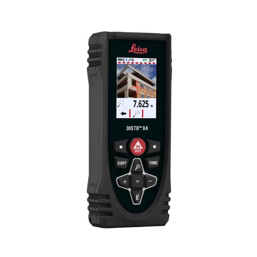 LEICA DISTO X-4 lāzera distances (tāluma) mērītājs. Precizitāte: ± 1,0mm. Mērīšanas attālums: līdz 150m. Datu interfeiss: Bluetooth Smart. Pitagora funkcija ar 3 punktiem. Baterijas: 2×1,5V, AA tipa . IP65 aizsardzība (ūdens un putekļu aizsargāts). “Leica Disto Plan” lietotne ļauj dokumentēt un vizualizēt mērījumus. Izmēri: 132x56x29mm. Svars: 188g.