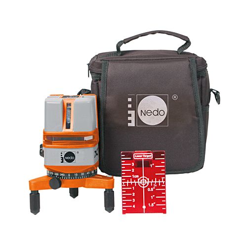 Lāzera nivelieris NEDO X-Liner4. Pašizlīdzinošs multi lāzera nivelieris ar horiontālām lāzera līnijām un divām vertikālām lāzera līnijām. Ūdensizturīgs. Izturīgs svārsts ar magnētisko amortizāciju. Precizitāte: +/- 0,3mm/m. Pašnolīdzināšanās diapazonā no + 3 grādiem. Darba diapazons Ø apmēram 50 m bez lāzera uztvērēja un apmēram 100m ar lāzera uztvērēju. Lāzera klase 2M, 630-680 nm. Aizsardzības klase IP 54. Barošanas avots 4 x 1.5 V tips / AA. Darbības ilgums apmēram 20 h.