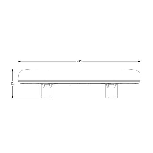 LED zemā profila bākuguns ar tonētu stiklu. Komplektā R65 (spoža gaisma). Aprīkota ar 60 LED diodēm. Izmēri: garums 410????mm, h=?mm. Darba spriegums: 12-24V. Darbības temperatūra: -30 līdz +50 grādi pēc Celsija. IP66 ūdens aizsardzības klase.