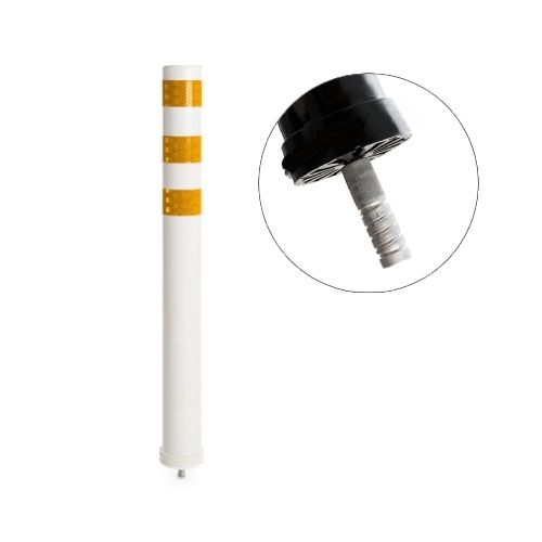 Stabiņš lokans, balts. Izmēri: augstums 100cm, diametrs 8cm (pieejams arī 40cm, 68cm un 80cm augstumā). Izgatavots no poliuretāna. Aprīkots ar atstarojošām joslām. Apakšējā daļas vītne noskrūvējama, iemontējama pamatnē ar līmi (ķīmiju) vai iebetonējama, stabiņš pēc tam uzskrūvējams uz pamatnē iestrādātās vītnes. Izturīgs, elastīgs. Trieciena rezultātā atgriežas sākotnējā stāvoklī. Taisna vai noapaļota augšdaļa (pēc izvēles). Papildus opcija par papildus samaksu – apakšējā daļā josla ar stikla atstarotājiem. Svars: 1.9kg.